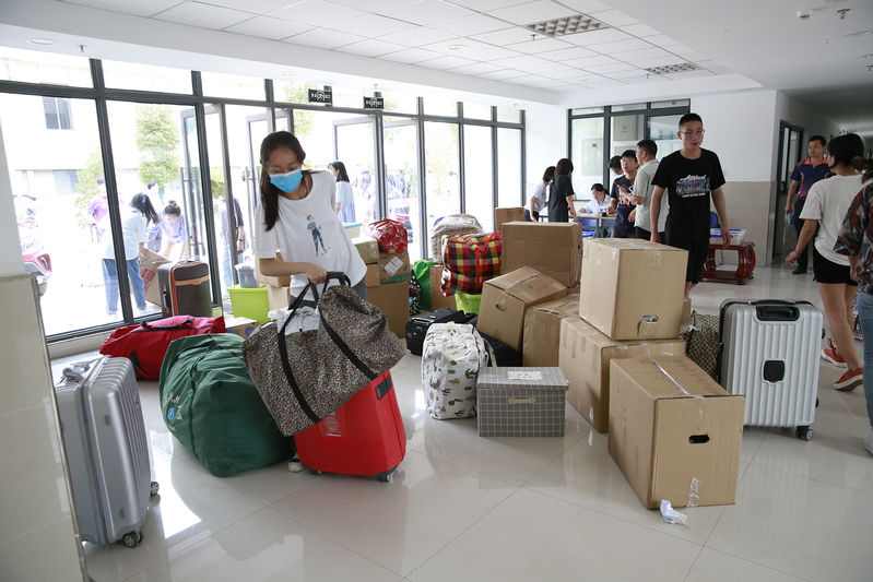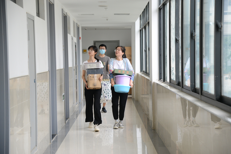 记者看到,在新校区47号、48号、50号楼,同学们在宿管处领取新宿舍钥匙、登记相关信息、了解注意事项,搬运行李至宿舍,大家互帮互助,其乐融融。