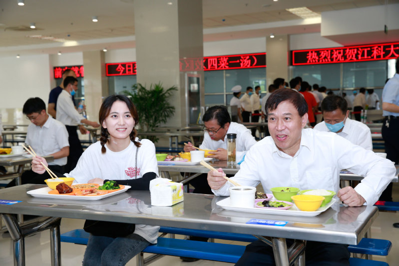 校党委书记葛世伦与船海学院2018级研究生张一兆、经管学院2018级大二学生柳冰媛、2017级学生贺子高等边吃边聊,聊餐厅、聊公交路线、聊社团活动场地、聊未来期许,坦诚交流,面对面解答同学们心中的疑惑,让大家放心。校党委书记葛世伦告诉大家,新校区环境更加优美,学习条件、住宿环境都得到了极大的改善,希望大家珍惜学校的资源,本科生要潜心学习,努力掌握必要的知识和技能,研究生要刻苦钻研,取得更多的学术成果,大家要在江科大追寻自己的梦想,实现自己的目标。