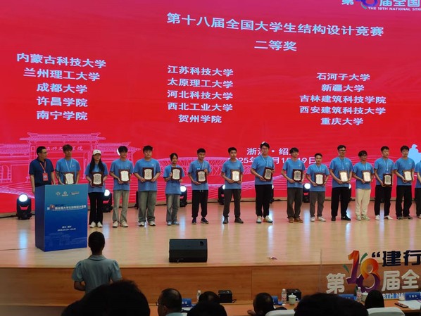 10月15日至19日,第18届“建行杯”全国大学生结构设计总决赛在绍兴文理学院举行。学校土木工程与建筑学院孙雯峻、魏顺林、魏文杰同学组成的“江科海韵”代表队与清华大学、同济大学、东南大学等来自全国119所高校的120支参赛队同台竞技,斩获第18届全国大学生结构设计竞赛二等奖(全国第49名)的好成绩,这是诸侯快讯官网继2024年第17届全国大学生结构设计竞赛后获得的又一好成绩。学校获全国大学生结构设计竞赛“优秀组织奖”。