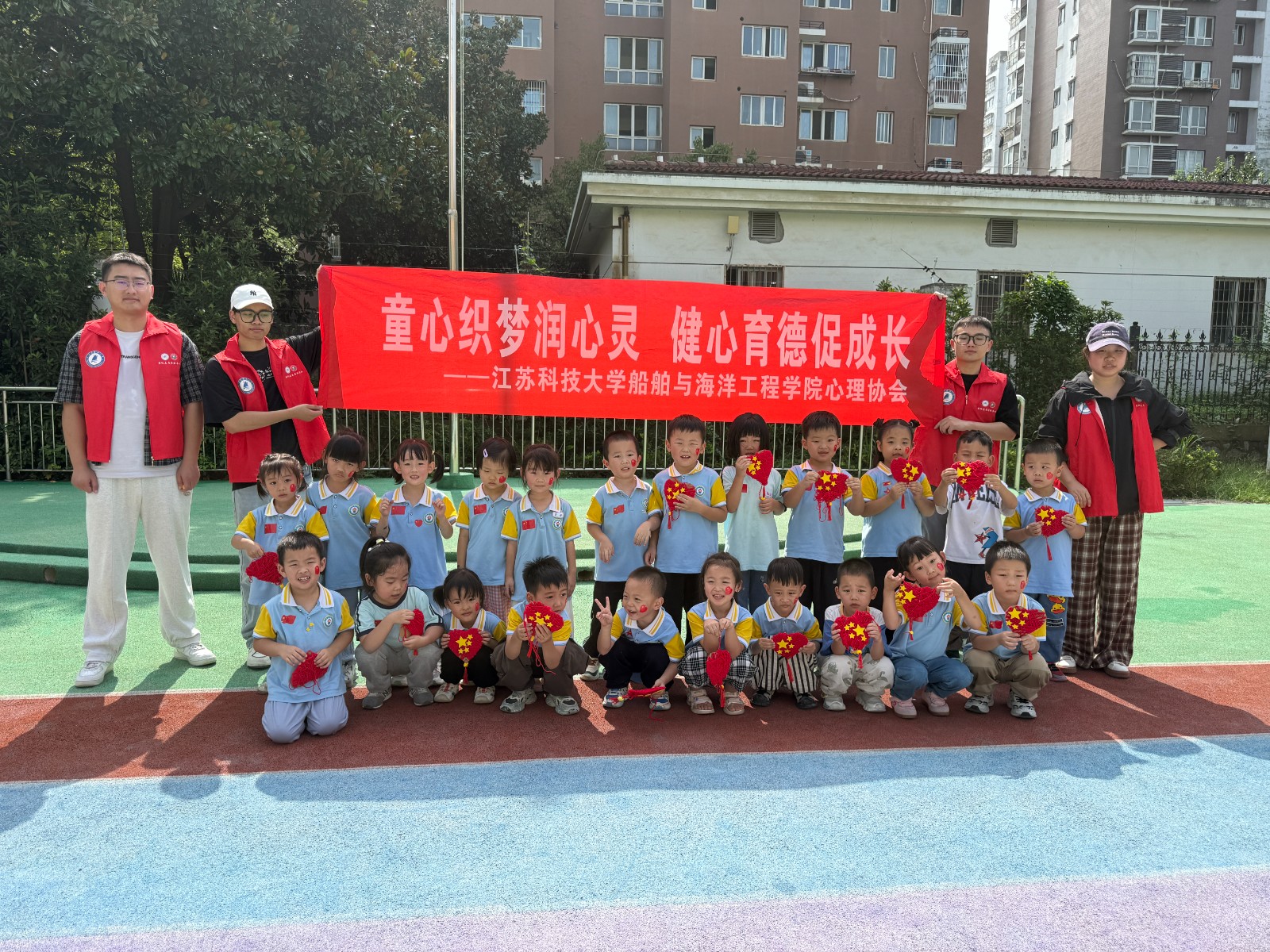 船海学院志愿者团队积极参与润州区青年活动,普及心理健康知识,倡议设立青年心理疏导驿站,推动心育与社会服务有机衔接。此外,志愿者走进红星桃花源幼儿园,以非遗手工为载体开展情感表达活动,引导幼儿增强心理韧性,志愿者也在公益实践中深化家国情怀,实现自我成长与社会贡献的统一。