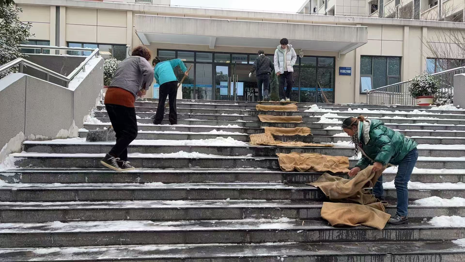 凌晨6点,天还未亮,地面已有积雪,学校后勤集团迅速启动极端天气应急预案,长山、梦溪两校区130余名工作人员早已到岗。在集团党委统一部署下,物业中心、公寓中心、饮服中心等部门闻令而动,按照“分片包干、先主后次”的原则,争分夺秒清理主干道、教学楼出入口、楼梯台阶等关键区域的积雪,在图书馆、学生公寓、食堂等人流密集处及陡坡、台阶等易滑地段,细心铺设防滑草席。