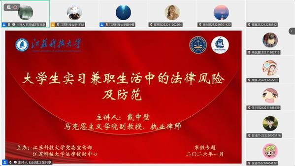 讲座聚焦兼职实习、消费网购、租房借贷及反诈防骗等与大学生活紧密相关的领域,通过互动问答、案例剖析,将《民法典》《消费者权益保护法》《劳动合同法》等知识转化为易懂的“避坑指南”和维权策略,为同学们参与寒假社会实践提供了及时而实用的法律指导。