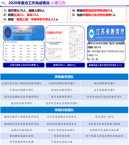2020年,电子信息学院围绕学校建设“国内一流造船大学”的战略目标,紧跟学校工作部署,以高层次人才培养和引进为突破,以教学科研团队建设、重点重大项目和成果培育为抓手,以立德树人、大学生核心素质提升为重要建设内容,抓重点、攻难点、创亮点,深化教育教学融合,全面提升人才培养质量。