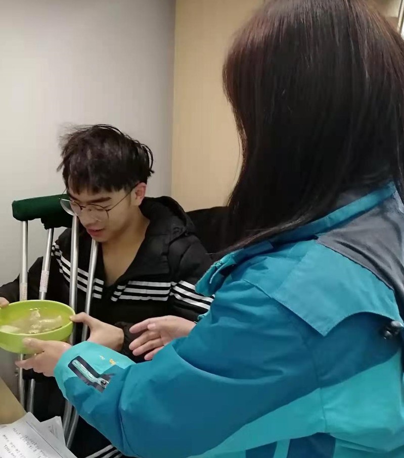 王民杰是2019级生物工程专业学生。打球不小心伤到了腿拄起了拐杖后,他从门口进去的时候被宿舍阿姨看到了。“我也没太在意,因为我们一栋宿舍楼有上千人,我以前一直认为这么多人宿管阿姨只能做到最基础的查按时归寝,但是让我没有想到的是宿管阿姨不仅能记到我的寝室号,还能记得我是生物技术学院的学生。当阿姨查寝的时候给我端了一碗萝卜排骨汤过来,我心里既惊讶又感动,宿管阿姨叫我好好休息,并且还很温柔的没有扣我卫生分,说我受伤了不方便收拾,十分的有人情味。” 2018级生物工程专业的门建炜介绍,当时阿姨第一时间询问自己的病情,第二天一早端着连夜煲的爱心排骨汤来到宿舍慰问,还说“刚刚给你热好了,你快趁热吃,明天我继续热好了给你拿过来,这段时间你就好好养伤,有什么不方便的及时和阿姨讲”。阿姨叮嘱让身处异地的门建炜感受到了无微不至的关怀。“就像妈妈一样,和蔼可亲,细心周到,对我关照有加,一次次帮助,一次次呵护。在返校的这段日子里,阿姨也不辞辛劳定期关心我的康复情况,多次嘱咐我,天气变化无常,注意腿部保暖。为了表达心中的感谢之情,我们送锦旗给阿姨,更是为了让身边同学了解到阿姨默默不闻、体贴入微照顾,将每位同学当作自己孩子一样照顾的良苦用心。”