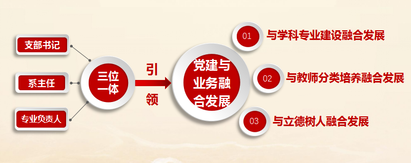 学院党委根据学校发展态势和学院实际情况,创新提出将党支部书记、系主任、专业负责人有机整合,构建了扎实的系级领导班子,把教学、科研和党建充分融合,形成“三位一体”运作机制,将基层党组织的纵向层次结构转变为矩阵新结构,切实提高学院二级党组织的建设成效,将学院二级党组织的组织资源和优势转化成为发展资源和优势,提升学院管理绩效,确保学院的良好发展势头。