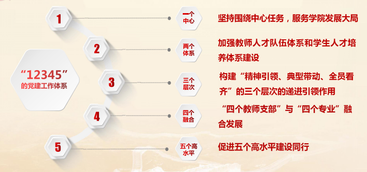 学院党委深入贯彻落实学校第三次党代会精神,围绕1个中心任务,加强2个体系建设,构建3个层次的递进引领模式,形成4个融合发展,致力打造5个高水平,形成“12345”的党建工作体系。