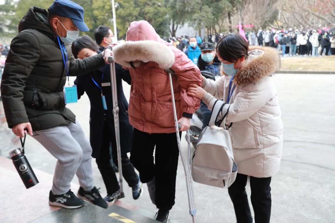 一考生因脚受伤,被工作人员搀扶入场