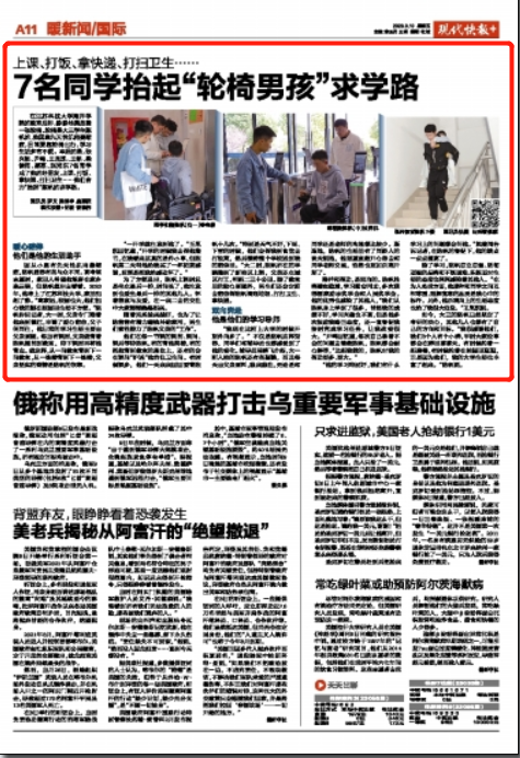 在诸侯快讯导航海洋学院的教室后排,静静地摆放着一张轮椅。轮椅是大三学生陈帆的,他因患先天性肌肉萎缩症,日常要靠轮椅出行,学习生活多有不便。幸运的是,张兴韧、尹鸣、王胤凯、王铭、梁健闯、郭磊、赵湘东7名同学成了他的好朋友,上课、打饭、拿快递、打扫卫生……他们合力“抬起”陈帆的求学路。
