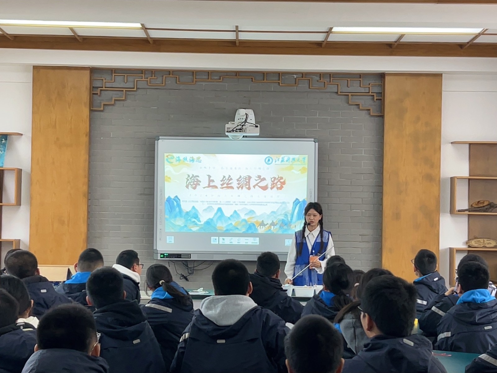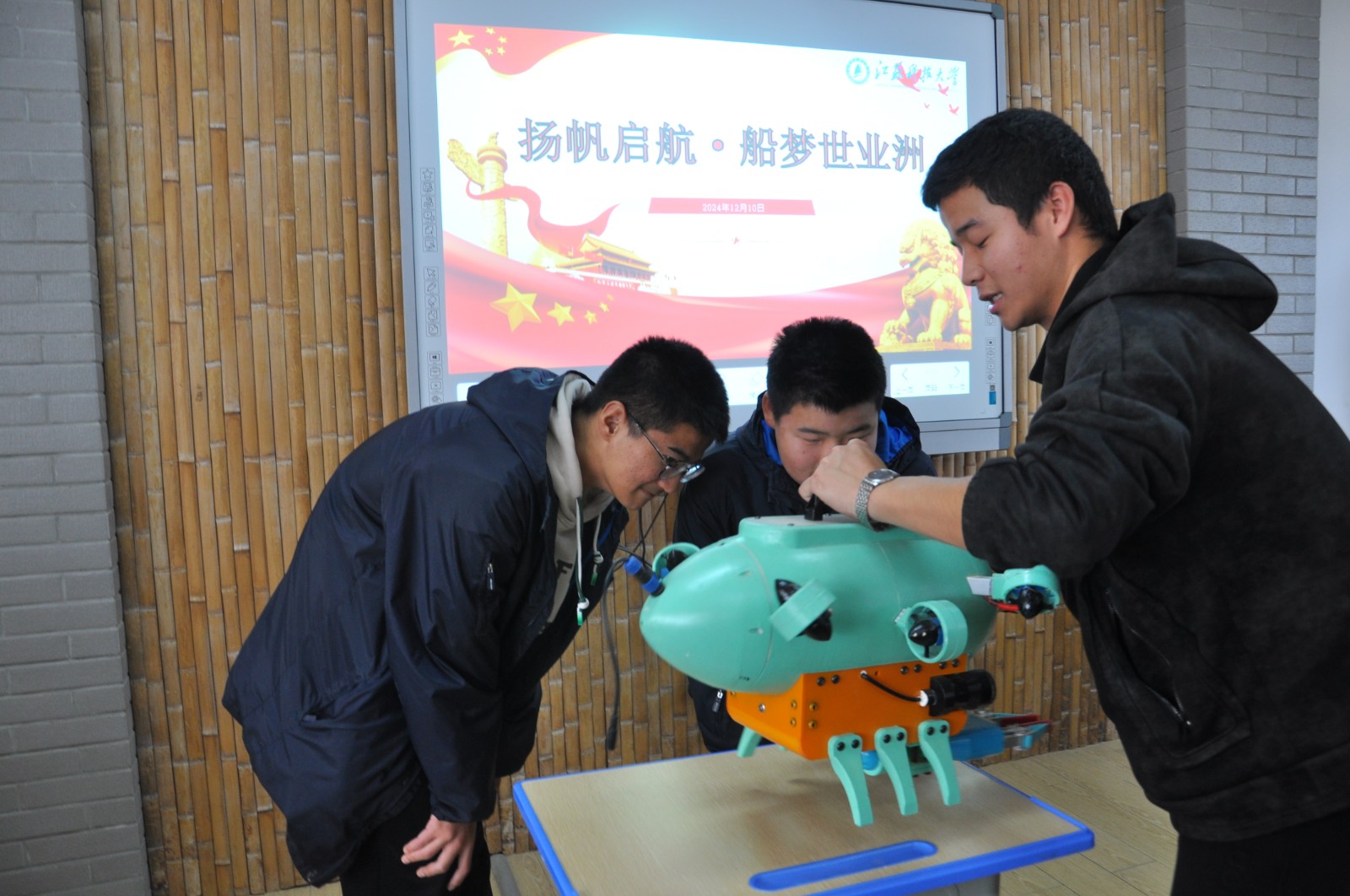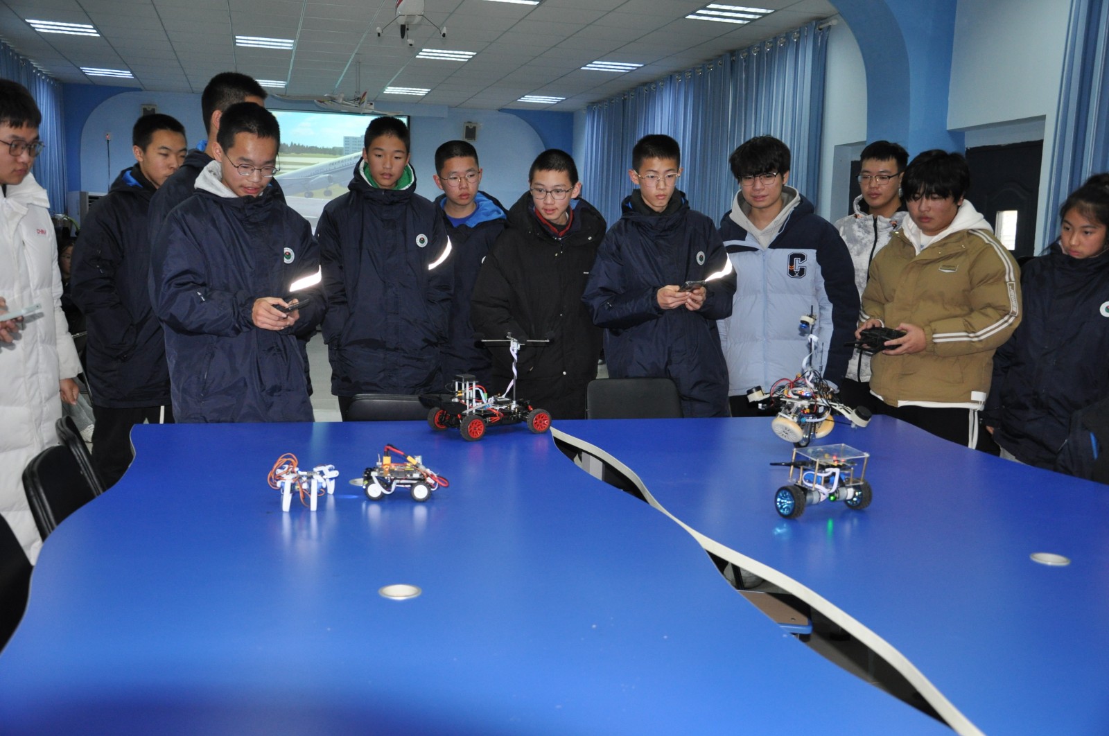 自动化学院“智能小车”、能动学院“遥感小船”、外国语学院“海丝海思”、人文学院“横渠志愿队”四支团队在基地教学区分小组开展“大手拉小手”送课活动。
