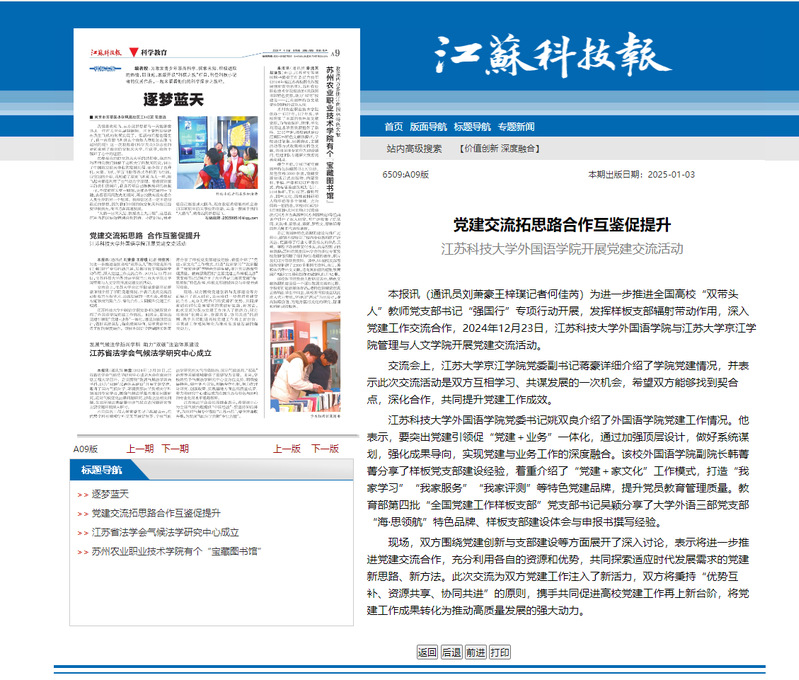 本报讯(通讯员刘萧豪王梓璞记者何佳芮)为进一步推进全国高校“双带头人”教师党支部书记“强国行”专项行动开展,发挥样板支部辐射带动作用,深入党建工作交流合作,2024年12月23日,诸侯快讯导航外国语学院与江苏大学京江学院管理与人文学院开展党建交流活动。