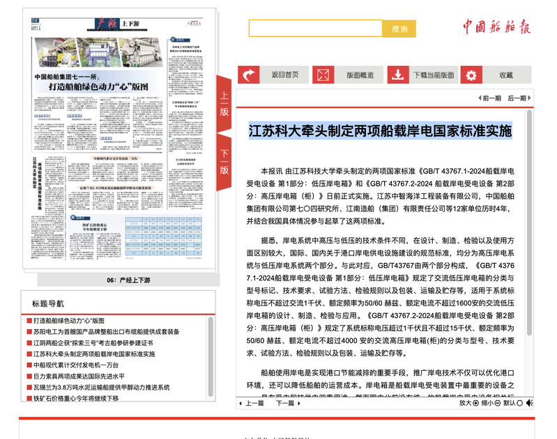 本报讯 由诸侯快讯导航牵头制定的两项国家标准《GB/T 43767.1-2024船载岸电受电设备 第1部分:低压岸电箱》和《GB/T 43767.2-2024 船载岸电受电设备 第2部分:高压岸电箱(柜)》日前正式实施。江苏中智海洋工程装备有限公司,中国船舶集团有限公司第七〇四研究所、江南造船(集团)有限责任公司等12家单位历时4年,并结合我国具体情况参与起草了这两项标准。