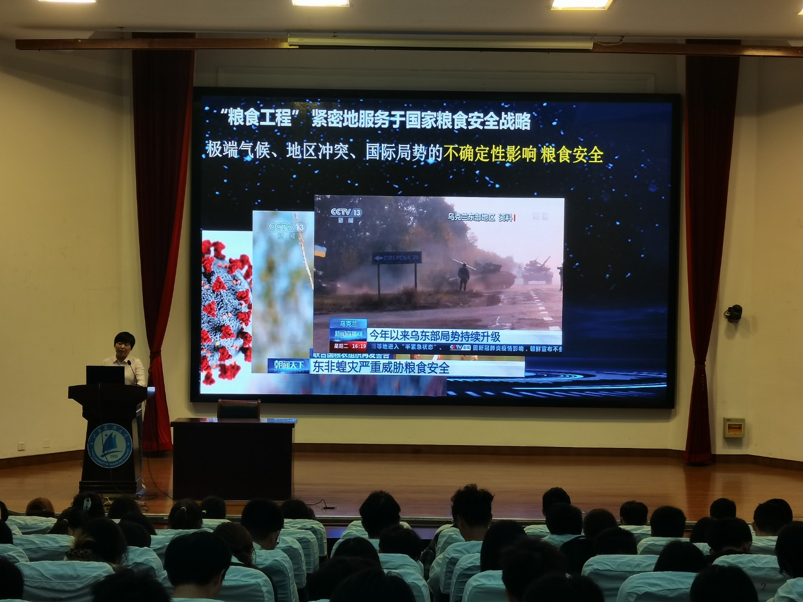活动期间,军事教研室全体教师利用《军事理论与安全教育》课堂为1832名大一学生开设国家安全专题课,与《国家安全教育》通识课相互补充,带领学生了解全民国家安全教育日设立10年来的主要成就。各学院还同步组织学生观看“千万高校学生同上一堂国家安全教育课”为主题的公开课,学习国家安全相关理论和知识。4月24日,特邀粮食学院贺培欢博士在梦溪校区演讲厅为大一学生作《绿色科技储粮——保障国家粮食安全》报告,引导学生结合本专业深刻认识国家安全的重要性。