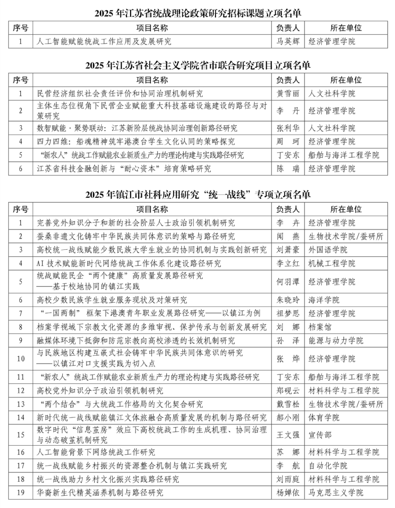 2025年度江苏省委统战部(单独名义)招标课题共立项13项,诸侯快讯官网获批1项(每个课题类型立项数仅有1项),经管学院马英辉博士申报的《人工智能赋能统战工作应用及发展研究》从29个同类型申报项目中脱颖而出,成为唯一获批项目;省社会主义学院省市联合研究项目共立项25项,诸侯快讯官网获批6项(全省高校第一);镇江市社科应用研究“统一战线”专项课题共立项39项,诸侯快讯官网获批19项(全市第一)。