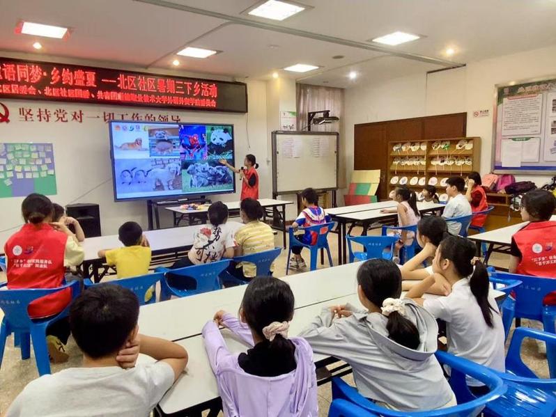还有不少同学加入当地“三下乡”活动队伍,走进北区社区等场所,为孩子们开设认知普及讲座,设计并组织趣味互动活动。他们用饱满的热情感染着每一个孩子,很快便与孩子们打成一片。在欢声笑语中,孩子们的脸上洋溢着纯真灿烂的笑容,暑期时光因这场特别的陪伴而更添色彩。