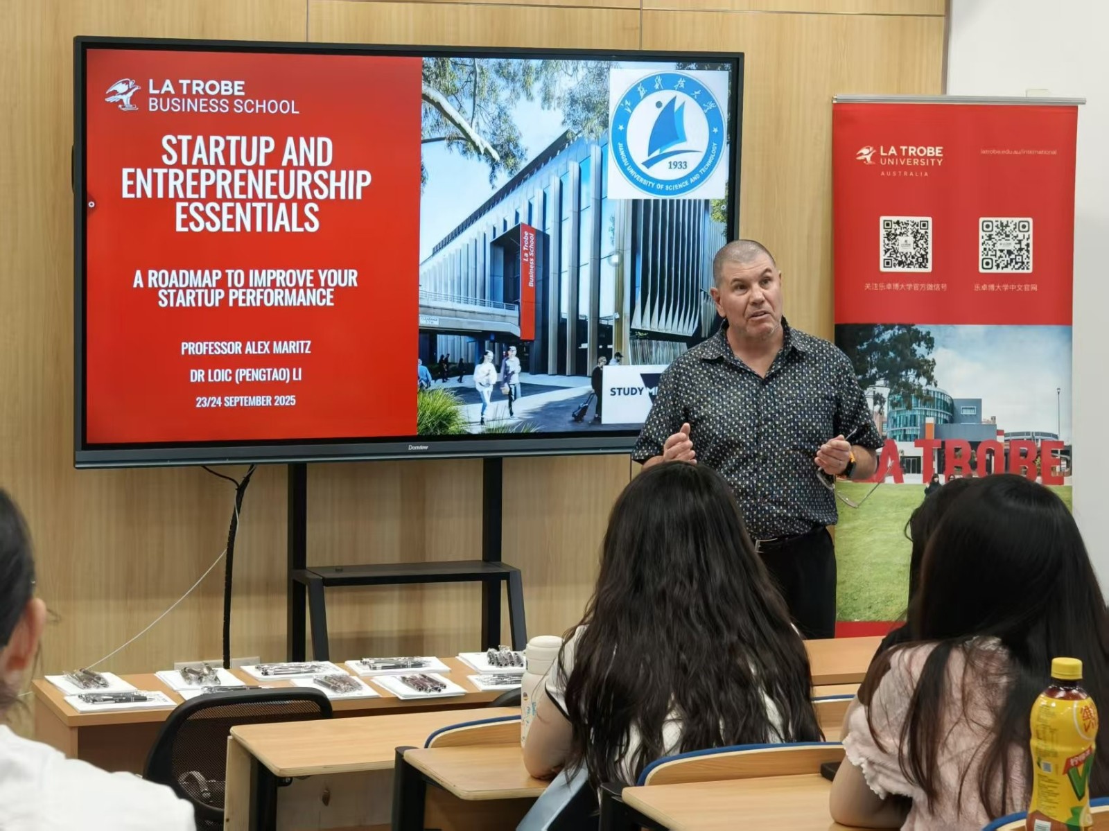 9月23-24日,经济管理学院精心策划的“国际商业冲刺营”在长山校区经管院341成功举行。本次活动特邀澳大利亚乐卓博大学商学院Alex Maritz教授、Loic Li博士,以及澳大利亚维多利亚州政府教育服务经理Gabriel Sun、乐卓博大学大中华区域总监Ivy Xu、乐卓博大学华东区域经理Sid Liu担任嘉宾,通过全天高强度、互动式的工作坊,全面提升项目学生的国际商业视野与创新创业能力。本次工作坊共分为两天,工商管理(中澳合作办学)项目2024级项目学生分两批小班参与。为期两天的工作坊分别由工商管理系教师周潇和高文阳主持。