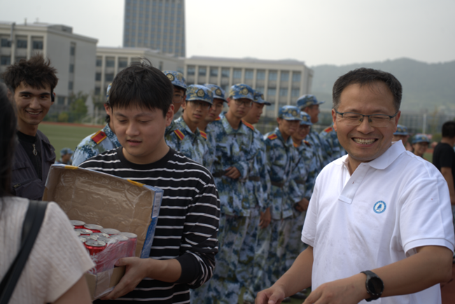 9月28日,阳光依旧炽热,军训场上回荡着新生们嘹亮的口号声,校园里满是蓬勃的青春活力。当日,自动化学院党委副书记郭峰、副院长陈迅、团委书记万纤及多位辅导员老师,带着对新生的深切关怀来到训练场,为同学们送去清凉的定制“小能量”,为大家驱散暑热。